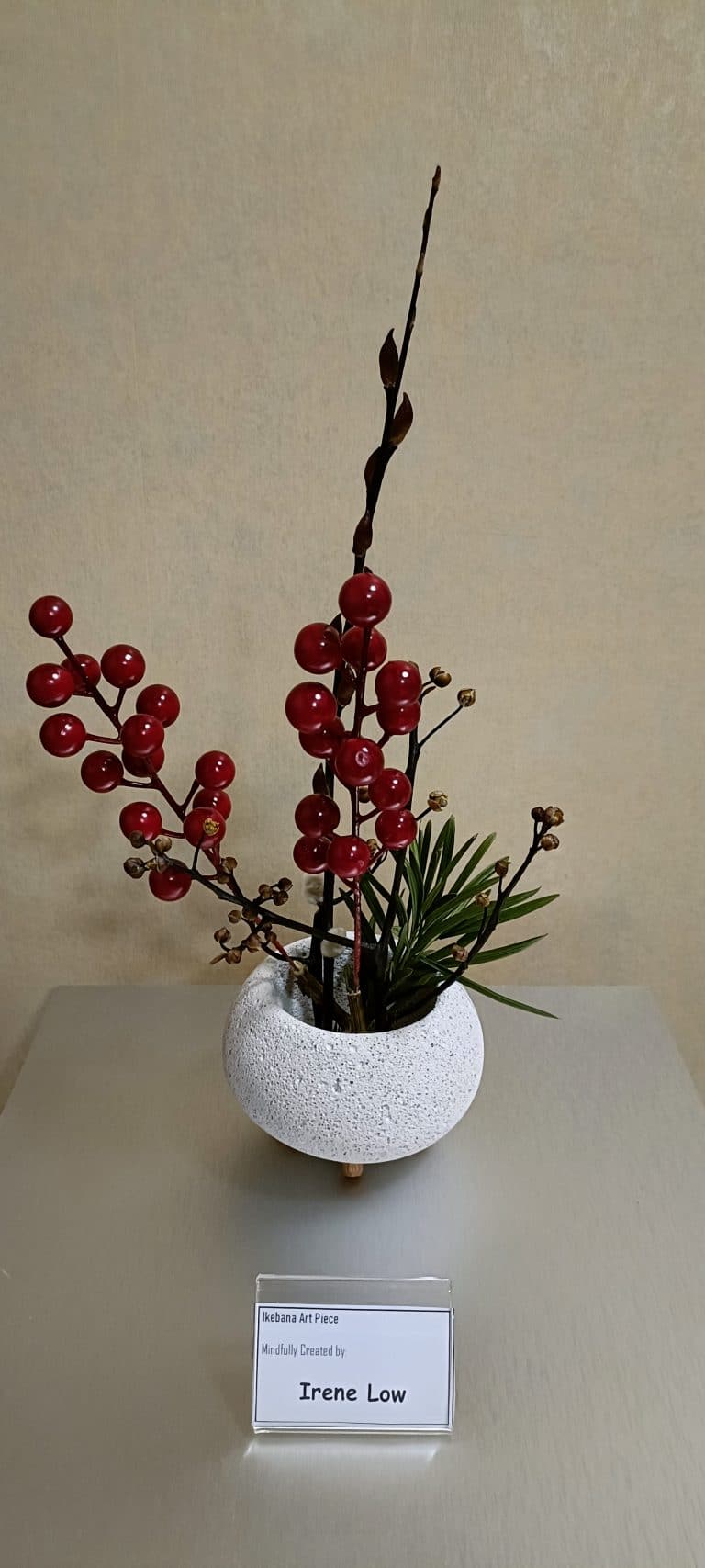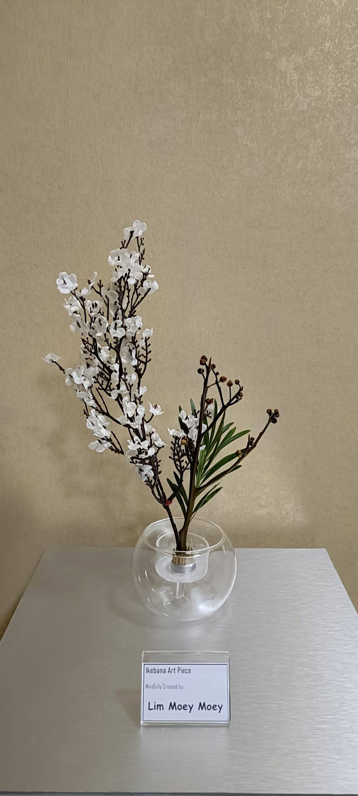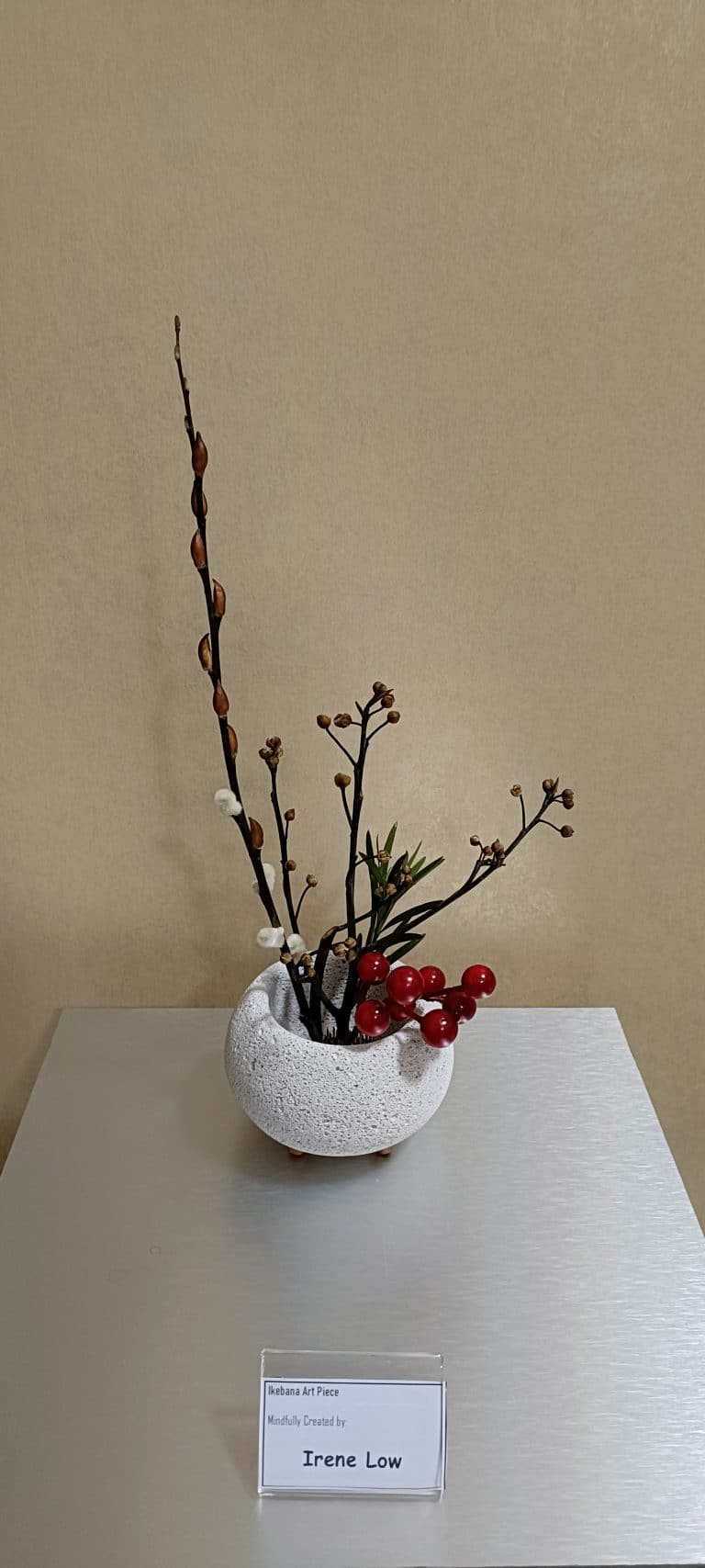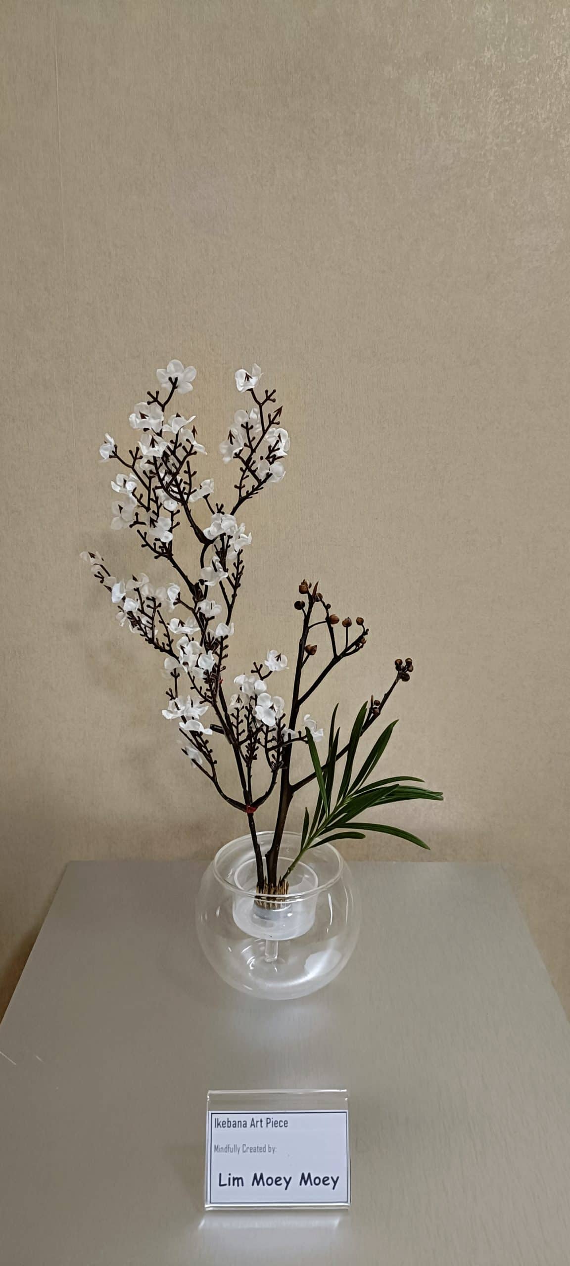 Our Buddhist society and Mind Place hope that a mindful introduction of traditional Ikebana would bring us back to simplicity and nature. A small-scale activity was hence organised prior to Lunar New Year for participating friends to experience Ikebana. Through a simple explanation and demonstration, and without prior concepts of Ikebana arrangement, participants first practised mindfulness meditation before commencing the activity. Thereafter, each in their own space that knows no limits, at their own free will and without any expectations, they gave full play to creative ideas, expressing their present state of being. One would marvel at their ingenuity, each in their own unique ways. Materials used were easily available ones such as dry branches, withered leaves and plastic flowers for festive decorations. In the floral displays, flowers and branches complement each other, achieving an overall balance and harmony. The curvy branches dance with elegance in the space, embodying flexibility in strength. Less is more, depicting the primeval essence of Ikebana.